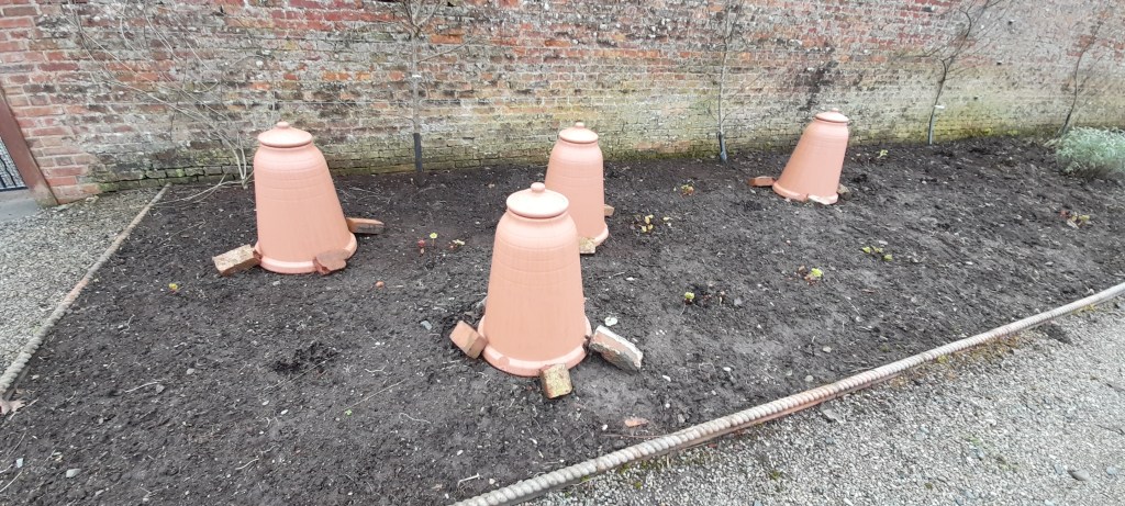 Despite the cold, the wet, and the wind, there are plants that are growing and showing that sign of promise that Spring is around the corner. The garlic and onions planted at the back end of last year have now got strong shoots, while the rhubarb is popping through the soil to provide much-welcomed colour. Some of the rhubarb crowns, and also a few of the sea kale, are being forced to provide a feast of early tasty stalks to the kitchen.
