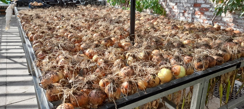In recent weeks we lifted all of the garlic, onions, and shallots from the Walled Garden. While the garlic was a mediocre haul, the latter two performed really well. Earlier in the year I did fear for our onions as attempts to grow them from seed struggled and I had to buy some replacement sets. Even those sets sat there doing little for longer than I would like. But all those fears were unfounded as in total we harvested around 650 onions, most of them a really good size. It is estimated there is close to 200 kilos of onions and on top of that are around six crates worth of shallots. The chefs won’t go short of onions for a while.