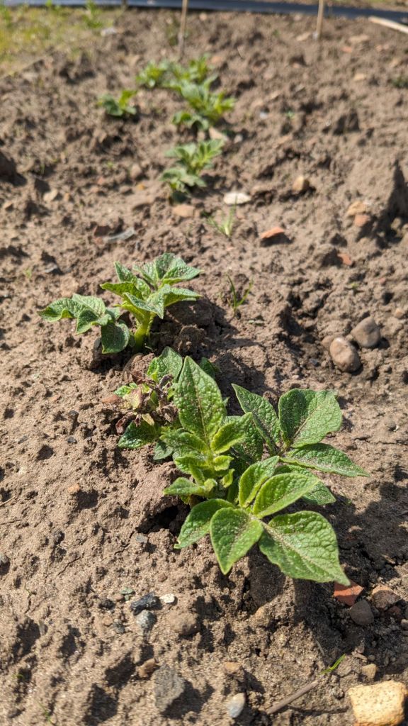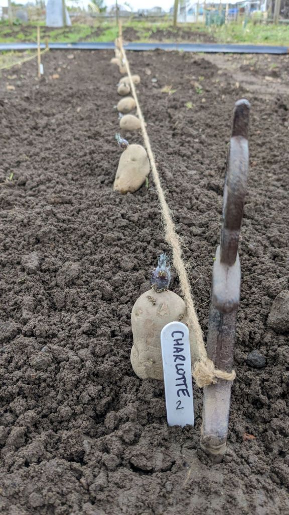 The first early potatoes went in at the end of March. Following in April were both the second early varieties of ‘Charlotte’ and ‘Estima’ and the maincrop ‘Pink Fir Apple’. At the end of the month, the first shoots of the first earlies were showing through the soil – which is great, but it will be best to earth them up quickly in case we get any more frosts. Overall, it means there are five different types of potatoes in total on the plot and that is going to be more than enough for us for the year.