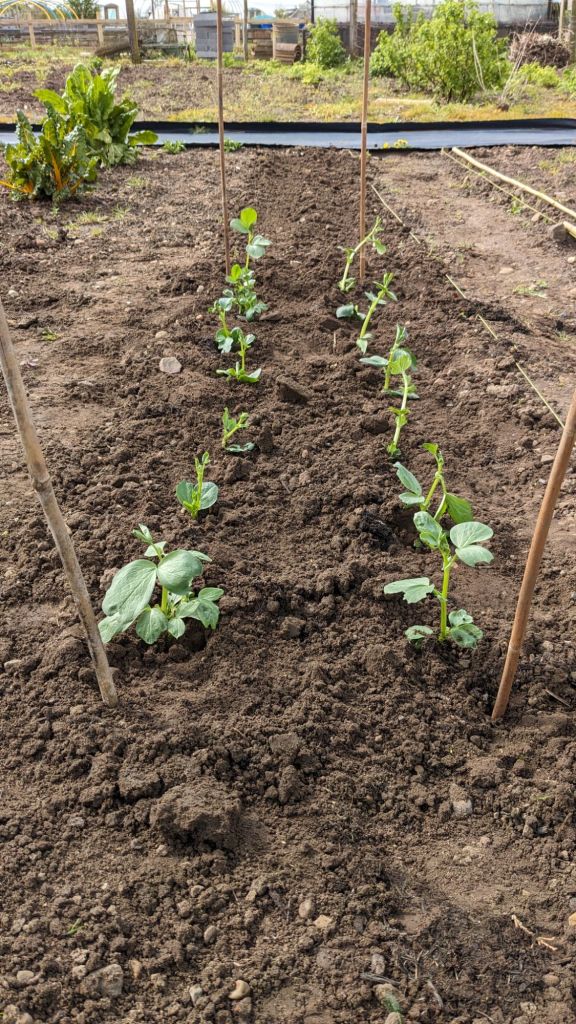 The other crop planted in April was broad beans. Unfortunately, I did not have great germination from the (admittedly old) broad bean seeds so I only ended up with a dozen or so to plant. Broad beans are always an enjoyable crop to grow, but I got the allotment too late last year to grow them. At least this year it means that, even though it may be a small one, at least I will get a broad bean harvest to enjoy.