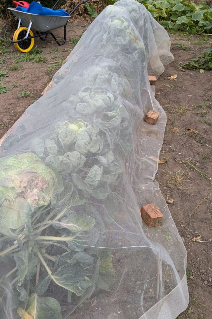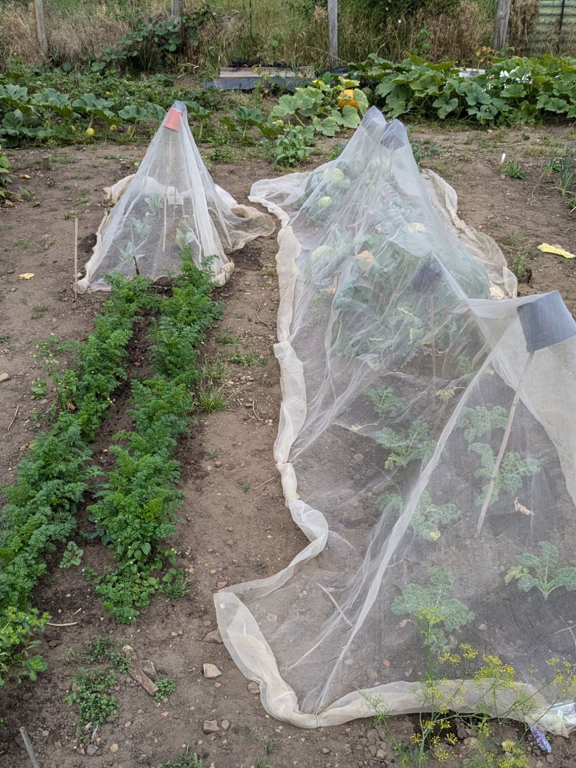 Next to the beans and chard are the carrots and more brassicas. Carrots were a struggle this year, this was my third and final attempt at sowing and, thankfully, we have carrots. In the brassica nets are cabbages that are being harvested regularly and young plants of both kale and cauliflower. These were planted in August to provide crops throughout the colder months.