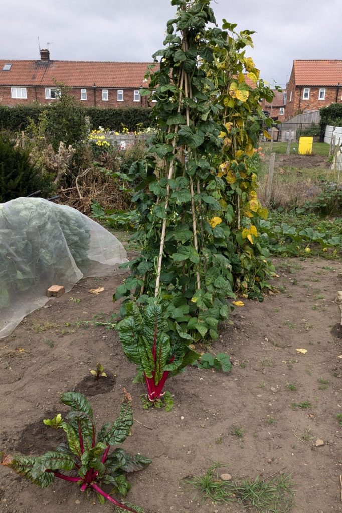Next to that is Swiss chard and the teepees contain the climbing French beans. The yellow chard plants bolted really early and have been replaced by new younger plants, but the red chard has happily grown all summer. The beans, grown from seed saved from last year’s crop, have romped up their supports and there are so many on there. I need to do regular big harvests and start to freeze them as, at the moment, it is a struggle to keep up with picking them.