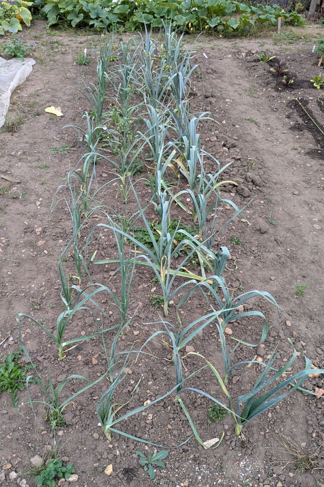 In the next bed are leeks. Two types of leeks ‘Elefant’ and ‘Lyon’ are slowly growing but seem to be happy and the focus is on just keeping them weeded. These had shallots next to them that were harvested last month.