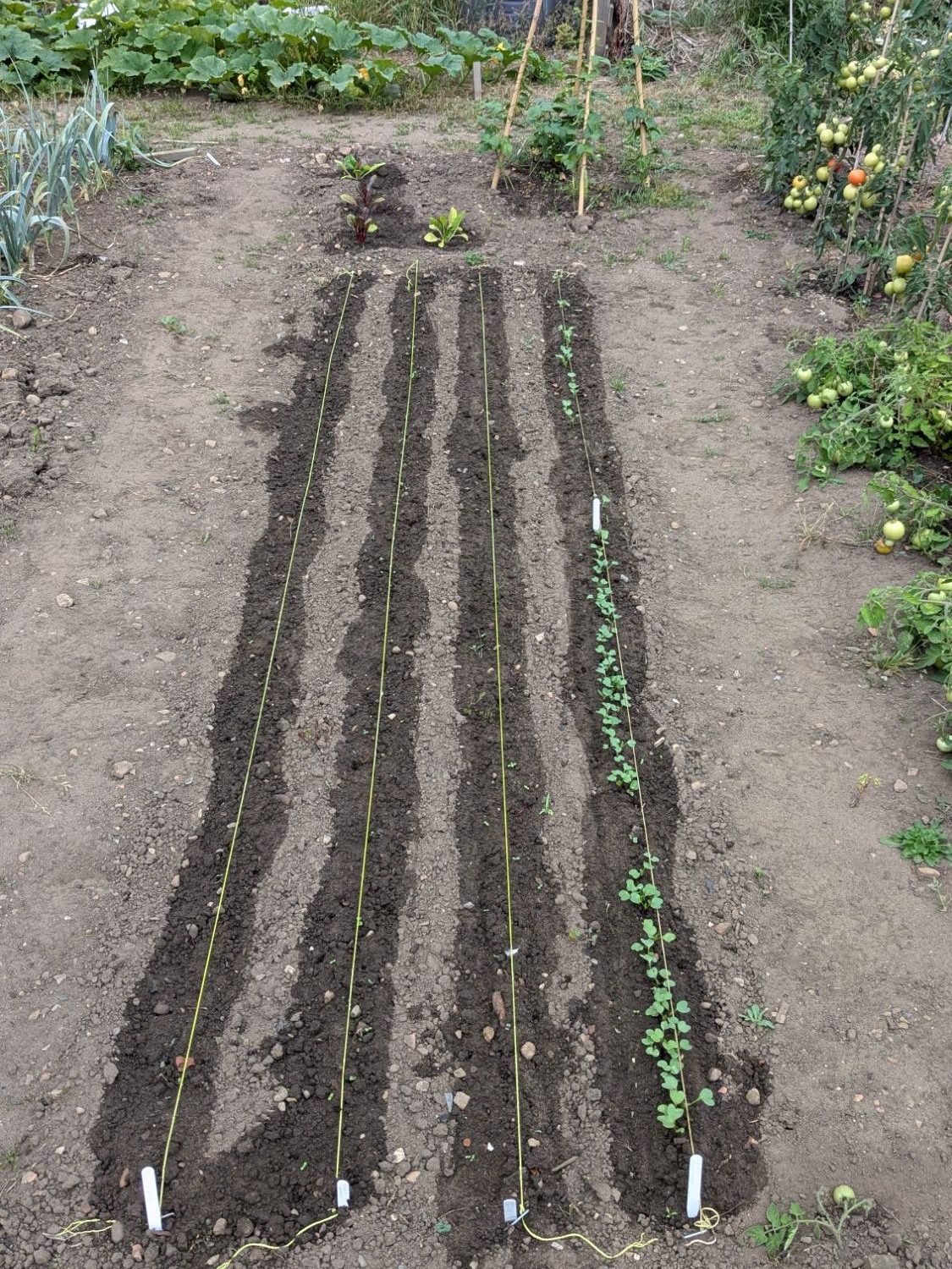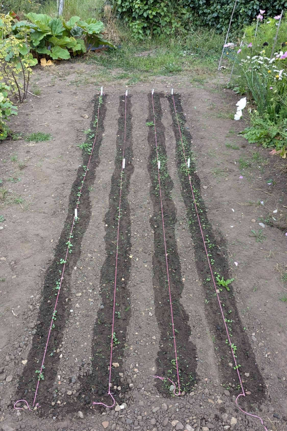 This block has got its second set of crops this year. I’ll hold my hands up and say the first ones didn’t do amazing, but there was a small harvest of beetroot and radish. This is where the first carrot sowings and parsnip sowing absolutely failed – and it has really struggled with bindweed – which is a real headache. I sowed turnips, winter radish, and mooli directly in August and, as you can see, the first seedlings are appearing. This bed should provide picking in the colder months, fingers crossed.