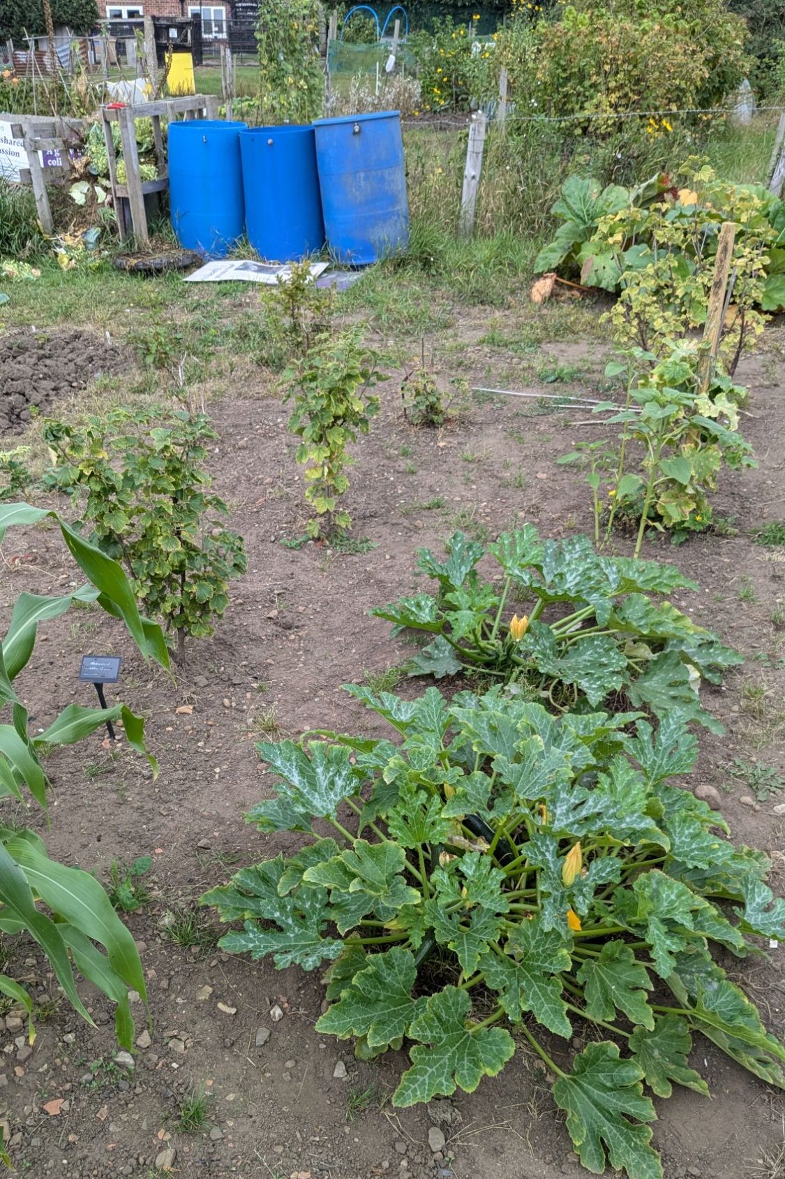This next block has soft fruit bushes, some gooseberries, whitecurrants, and blackcurrants. There is also some sweetcorn, the courgettes, and a climbing cucumber. We are amid the annual courgette glut and the cucumber has also done pretty well. Alas, birds beat us the the soft fruit that did appear – but the bushes are only young and not doing bad for their second year.