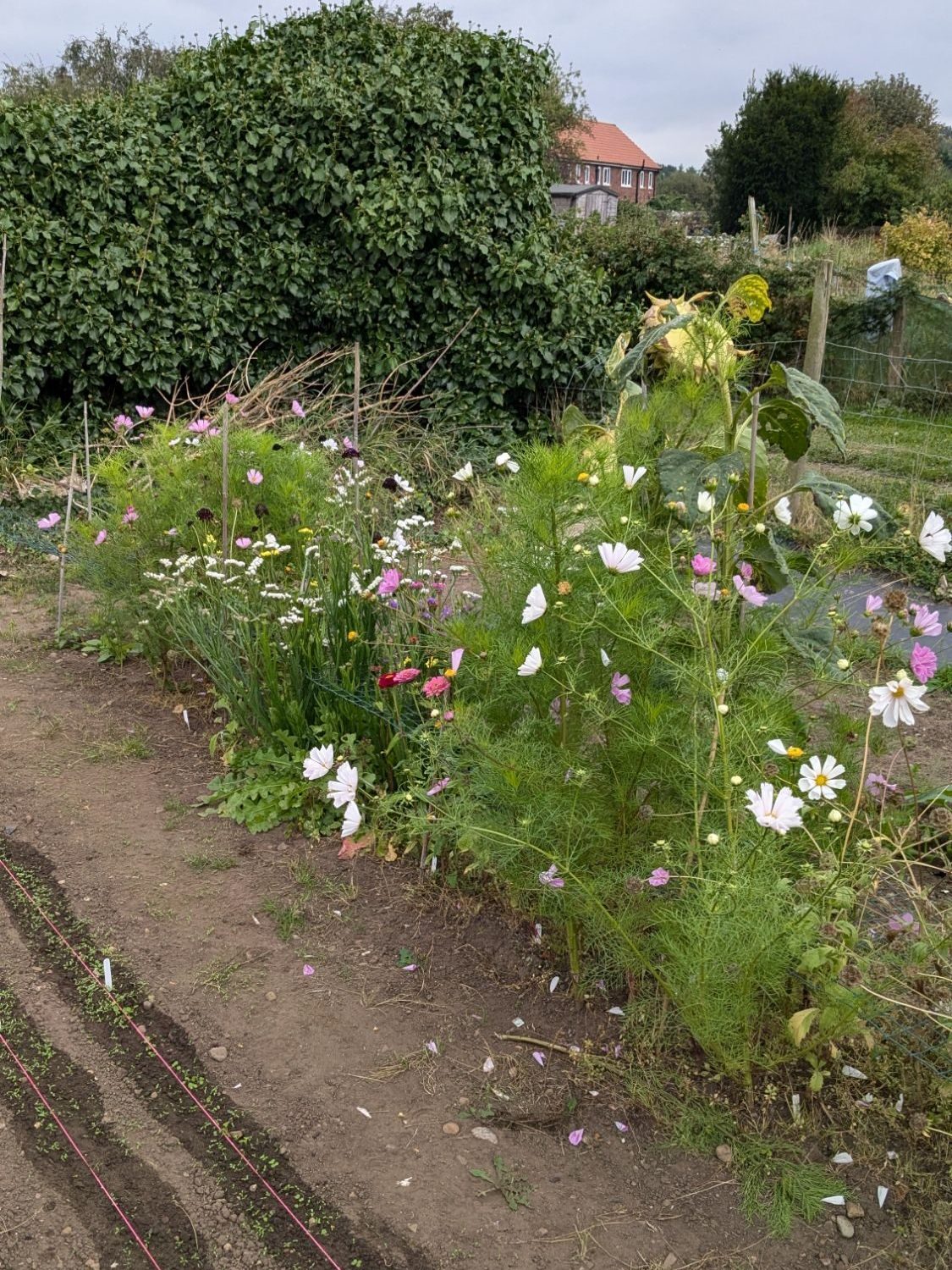 Towards the back of the allotment is the cut flower section. It has been dominated by some tall and statuesque sunflowers and now there are cosmos, zinnia, scabious, nigella, cornflower, and more all mixed and matched together. I am enjoying the range of colours and textures on display and these flowers really brighten up the space.